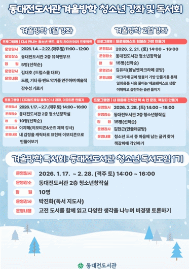 ƯÈ÷ À̹ø °Ü¿ï¹æÇп¡ »õ·Ó°Ô ¼±º¸ÀÌ´Â ¡ãµ¿´ëÀüµµ¼°ü û¼Ò³â µ¶¼ ¸ðÀÓ 1±â´Â û¼Ò³âµéÀÌ °íÀü µµ¼¸¦ ÇÔ²² Àаí ÀÚÀ¯·Ó°Ô »ý°¢À» ³ª´©´Â µ¶¼È¸·Î, Ã¥À» ±íÀÌ ÀÐ°í °æÀïÀ̳ª Æò°¡ ¾øÀÌ ¼·Î ÀǰßÀ» ÀÚÀ¯·Ó°Ô ÁÖ°í¹ÞÀ¸¸ç µ¶¼ Ȱµ¿¿¡ ´ëÇÑ Èï¹Ì¸¦ ´À³¥ ¼ö ÀÖµµ·Ï ÇÏ´Â °ÍÀ» ¸ñÇ¥·Î ÇÑ´Ù.