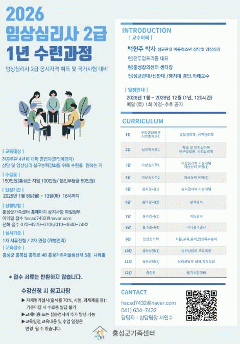 '¾Æµ¿ ½É¸®»ó´ã Àü¹®°¡ ¾ç¼º'°úÁ¤Àº ½É¸®Çа³·Ð, ÀÌ»ó½É¸®ÇÐ, ½É¸®°Ë»ç µî À̷мö¾÷°ú ÇöÀå ½É¸®»ó´ã Âü¿©¸¦ ÅëÇÑ ÀÓ»ó ½Ç¹« ¼ö¾÷À¸·Î ÁøÇàµÈ´Ù. ±³À°°úÁ¤Àº ¿À´Â 2¿ùºÎÅÍ 12¿ù±îÁö ÃÑ 12ȸ±â·Î ¸Å¿ù ¼Â°ÁÖ Åä¿äÀÏ¿¡ ¿î¿µÇÒ ¿¹Á¤À̸ç, ±³À° ¼ö·áÀÚ´Â ÀÓ»ó½É¸®»ç 2±Þ(±¹°¡ÀÚ°ÝÁõ) Ãëµæ ÀÀ½ÃÀÚ°ÝÀÎ ¼ö·áÁõÀ» ¹Þ°Ô µÈ´Ù.