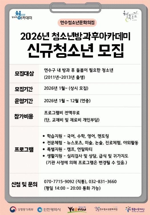 ¡®Ã»¼Ò³â¹æ°úÈľÆÄ«µ¥¹Ì¡¯´Â ¼ºÆòµî°¡Á·ºÎ¿Í Áö¹æÀÚÄ¡´Üü°¡ ÃßÁøÇÏ´Â ±¹°¡Á¤Ã¥Áö¿ø »ç¾÷À¸·Î, ¹æ°úÈÄ µ¹º½ÀÌ ÇÊ¿äÇÑ Ã»¼Ò³âÀÇ °Ç°ÇÑ ¼ºÀåÀ» µ½±â À§ÇØ Ã¼Ç衤¿ª·® °È Ȱµ¿, ÇнÀ ¹× »ýȰ Áö¿ø µî Á¾ÇÕ ¼ºñ½º¸¦ Á¦°øÇÑ´Ù.
