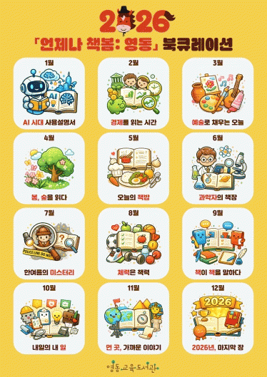 2026³â ¿ùº° ¿î¿µ ÁÖÁ¦´Â ¡ã1¿ù AI ½Ã´ë »ç¿ë¼³¸í¼ ¡ã2¿ù °æÁ¦¸¦ Àд ½Ã°£ ¡ã3¿ù ¿¹¼ú·Î ä¿ì´Â ¿À´Ã ¡ã4¿ù º½, ½£À» Àд٠¡ã5¿ù ¿À´ÃÀÇ Ã¥¹ä ¡ã6¿ù °úÇÐÀÚÀÇ Ã¥Àå ¡ã7¿ù ÇÑ¿©¸§ÀÇ ¹Ì½ºÅ͸® ¡ã8¿ù ü·ÂÀº Ã¥·Â ¡ã9¿ù Ã¥ÀÌ Ã¥À» ¸»ÇÏ´Ù ¡ã10¿ù ³»ÀÏÀÇ ³» ÀÏ ¡ã11¿ù ¸Õ °÷, °¡±î¿î À̾߱⠡ã12¿ù 2026³â, ¸¶Áö¸· ÀåÀÌ´Ù.