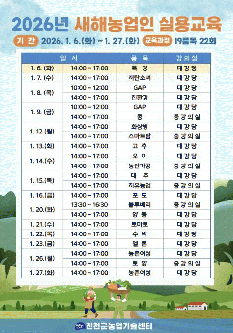±³À°³»¿ëÀº Áö³ 6ÀÏ ¡®ÁøÃµ±º âÁ¶³ó¾÷À» À§ÇÑ ³ó¾÷°¡ Á¤½Å¡¯¿¡ °üÇÑ Æ¯°À» ½ÃÀÛÀ¸·Î, Àúź¼Ò º, ½º¸¶Æ®ÆÊ, ¼ö¹Ú, ¿ÀÀÌ, Å丶Åä, µî ÁÖ¿ä ÀÛ¸ñº° ±³À°°ú °ú¼ö È»óº´ ¿¹¹æ, GAP, ģȯ°æ ÀÎÁõ °ü·Ã Çʼö±³À°ÀÌ ÇÔ²² ÁøÇàµÉ ¿¹Á¤ÀÌ´Ù.