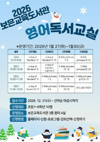 ¡®¿µ¾î µ¶¼ ±³½Ç¡¯Àº °ü±âÃʵîÇб³ ¾ö»óÁø ±³»çÀÇ Àç´É ±âºÎ·Î 3³â° À̾îÁö°í ÀÖ´Â ÇÁ·Î±×·¥À¸·Î, 1¿ù 27ÀϺÎÅÍ 30ÀϱîÁö 4Àϰ£ ÃʵîÇб³ 1~6Çгâ ÇлýÀ» ´ë»óÀ¸·Î ¿î¿µµÈ´Ù.