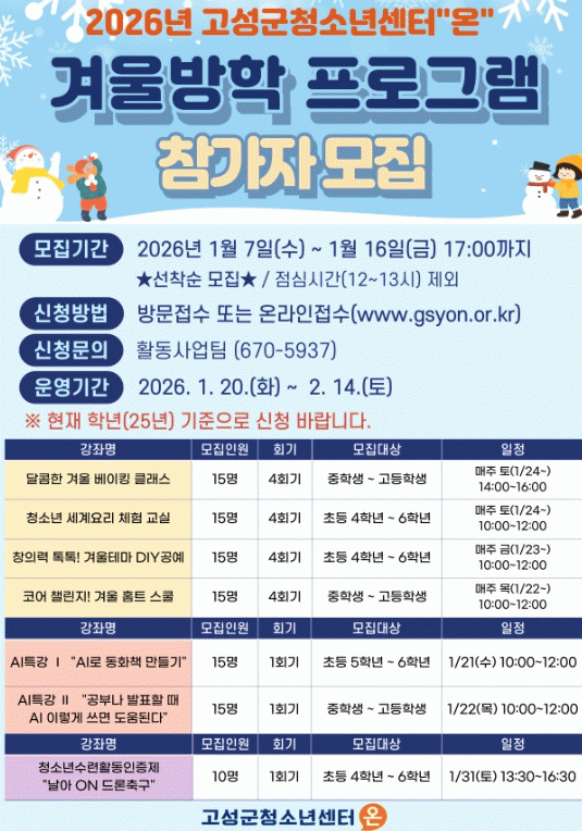 °Ü¿ï¹æÇÐ ÇÁ·Î±×·¥ ¹× Ư°Àº 1¿ù 7ÀϺÎÅÍ Á¢¼ö °¡´ÉÇϸç ÃÑ 7°³ °Á·ΠÂü¿©´ë»óÀÚ´Â °í¼º±º¿¡ ÁÖ¼Ò¸¦ µÐ û¼Ò³âÀº ´©±¸³ª ½Åû °¡´ÉÇÏ¸ç °í¼º±ºÃ»¼Ò³â¼¾ÅÍ¡°¿Â¡± ȨÆäÀÌÁö ¶Ç´Â ¹æ¹® Á¢¼ö¸¦ ÅëÇØ ½ÅûÇÏ¸é µÈ´Ù.