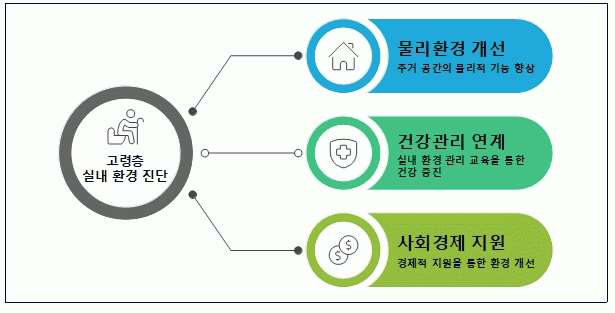 ÀÌ¿¡ º» ¿¬±¸´Â °í·ÉÃþÀÇ °Ç°ÇÑ ³ë³â »ýȰÀ» Áö¿øÇϱâ À§ÇØ ¹°¸®¡¤È¯°æ °³¼±, °Ç°°ü¸® ¿¬°è, »çȸ°æÁ¦ Áö¿ø µî 3´ë Á¤Ã¥ ¹æÇâÀ» ¼³Á¤ÇÏ°í ±¸Ã¼ÀûÀÎ ¼¼ºÎ °úÁ¦¸¦ Á¦¾ÈÇß´Ù. ÁÖ¿ä °úÁ¦·Î´Â ¡ã°í·ÉÃþ ½Ç³» ȯ°æ ÀÌ¿ë±Ç(¹Ù¿ìó) µµÀÔ, ¡ãüÇèÇü ½Ã´Ï¾î ½Ç³» ȯ°æ ±³À° ¿î¿µ, ¡ãã¾Æ°¡´Â ¿¡³ÊÁö ¼ºñ½º µµÀÔ µîÀÌ Á¦½ÃµÆ´Ù.