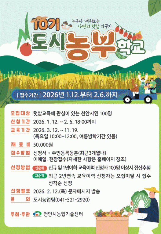 ¼¾Åʹ ü°èÀûÀ¸·Î ³ó¾÷¿¡ ´ëÇØ ¹è¿ì°í ½ÍÀº ½Ã¹ÎµéÀ» À§ÇØ Ãµ¾Èµµ½Ã³óºÎÇб³¸¦ ¿î¿µÇϰí ÀÖ´Ù.