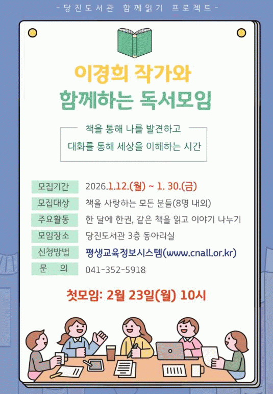 µ¶¼¸ðÀÓÀº ¸Å¿ù ÇѱÇÀÇ µµ¼¸¦ ¼±Á¤ÇØ ÇÔ²² Àаí, ´çÁøµµ¼°ü 3Ãþ µ¿¾Æ¸®½Ç¿¡¼ Á¤±âÀûÀÎ Åä·ÐÀ» ÁøÇàÇÏ´Â ¹æ½ÄÀ¸·Î ¿î¿µµÈ´Ù.