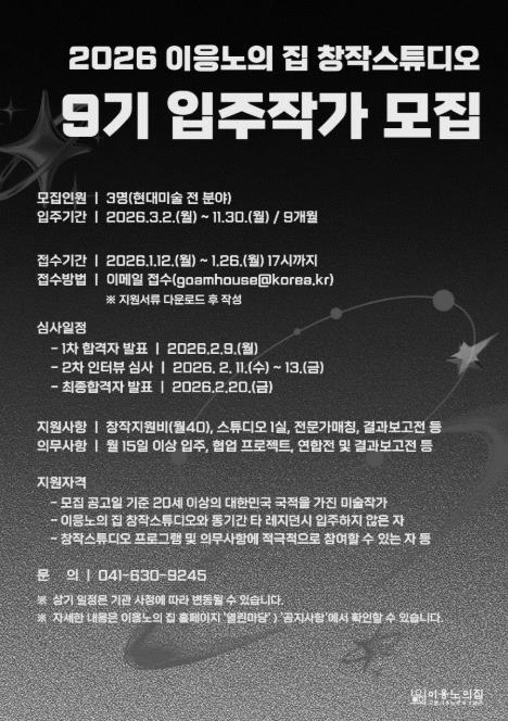 À̹ø 9±â ÀÔÁÖÀÛ°¡´Â ÃÑ 3¸íÀ» ¼±¹ßÇϸç, À帣 Á¦ÇÑ ¾øÀÌ Çö´ë¹Ì¼ú Àü ºÐ¾ßÀÇ ÀÛ°¡°¡ Áö¿øÇÒ ¼ö ÀÖ´Ù. ¼±Á¤µÈ ÀÛ°¡µéÀº ¿À´Â 3¿ùºÎÅÍ 11¿ù±îÁö ¾à 9°³¿ù°£ ÀÌÀÀ³ëÀÇ Áý âÀÛ½ºÆ©µð¿À¿¡ ÀÔÁÖÇØ âÀÛ ¹× °ÅÁÖ °ø°£À» Áö¿ø¹Þ´Â´Ù. ÀÌ¿Í ÇÔ²² ¿ù 40¸¸ ¿øÀÇ Ã¢ÀÛÁö¿øºñ, Àü¹®°¡ ¸ÅĪ ÇÁ·Î±×·¥, ·¹Áö´ø½Ã ¿¬ÇÕÀü Âü¿©, °á°úº¸°íÀü °³ÃÖ µî ´Ù¾çÇÑ Ã¢ÀÛ Áö¿ø ÇÁ·Î±×·¥ÀÌ Á¦°øµÈ´Ù.