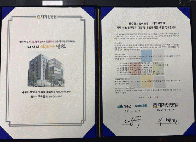 À̹ø Çù¾àÀ» ÅëÇØ ±ºÀº Áö¿ª ³» ½É³úÇ÷°üÁúȯ ȯÀÚÀÇ °ñµçŸÀÓ È®º¸´Â ¹°·Ð Àü¹® ÀÇ·á±â°ü°úÀÇ À¯±âÀûÀÎ Çù·ÂÀ» ÅëÇØ Ä¡·á ¼º°ø·üÀ» ³ôÀÌ°í ±º¹ÎÀÇ °Ç° ¾ÈÀü¸ÁÀ» ÇÑÃþ °ÈÇÒ ¼ö ÀÖÀ» °ÍÀ¸·Î ±â´ëÇϰí ÀÖ´Ù.