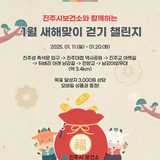ƯÈ÷ ¡®°È±â 縰Áö¡¯ Âü¿©ÇØ ¸ñÇ¥¸¦ ´Þ¼ºÇÏ¸é ¼ÒÁ¤ÀÇ Àμ¾Æ¼ºêµµ ¹ÞÀ» ¼ö ÀÖ¾î ¡®Àϼ®ÀÌÁ¶¡¯ÀÇ È¿°ú¸¦ °ÅµÑ ¼ö ÀÖ´Ù. ¡®°È±â 縰Áö¡¯´Â ¸Å´Þ 1ȸ ÀÌ»ó Á¤±âÀûÀ¸·Î ¿î¿µµÇ¸ç, ÁøÁÖÀÇ ´ëÇ¥ÀûÀÎ ¸í¼Ò¿Í »ýȰ ¼ÓÀÇ °È±â ÁÁÀº ±æÀ» Áß½ÉÀ¸·Î ÄÚ½º¸¦ ÁöÁ¤ÇØ ÁøÇàµÉ ¿¹Á¤ÀÌ´Ù.