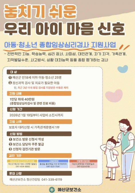 À̹ø »ç¾÷Àº Á¤¼¡¤Çൿ ¹®Á¦¿Í ÇнÀ ¹× ´ëÀΰü°è ¾î·Á¿ò µî Á¤½Å°úÀû Æò°¡°¡ ÇÊ¿äÇÑ ¸¸ 18¼¼ ÀÌÇÏ ¾Æµ¿¡¤Ã»¼Ò³âÀ» ´ë»óÀ¸·Î Á¾ÇÕÀûÀÎ ½É¸®°Ë»ç¿Í Áø·á ¿¬°è¸¦ Áö¿øÇØ Á¤½Å °Ç° ¹®Á¦ ¿¹¹æ°ú Á¶±â °³ÀÔÀ» ¸ñÀûÀ¸·Î ÇÑ´Ù.