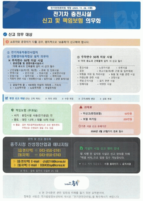 ÀÌ¹Ì ¿î¿µ ÁßÀÎ ±âÁ¸ ÃæÀü½Ã¼³ÀÇ °æ¿ì¿¡µµ ¹ý ½ÃÇàÀÏÀÎ 2025³â 11¿ù 28ÀϺÎÅÍ 6°³¿ù À̳»ÀÎ 2026³â 5¿ù 27ÀϱîÁö ½Å°í¿Í ¹è»óÃ¥ÀÓº¸Çè °¡ÀÔÀ» ¿Ï·áÇØ¾ß Çϸç, À̸¦ ÀÌÇàÇÏÁö ¾ÊÀ» °æ¿ì °úÅ·ᰡ ºÎ°úµÈ´Ù.