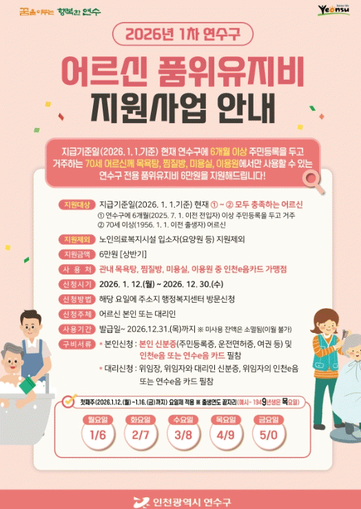 Áö¿ø ´ë»óÀº Áö±Þ ±âÁØÀÏ(1¿ù 1ÀÏ) ÇöÀç ¿¬¼ö±¸¿¡ 6°³¿ù ÀÌ»ó Áֹεî·ÏÀ» µÎ°í °ÅÁÖÇÏ´Â 70¼¼ ÀÌ»ó ¾î¸£½ÅÀÌ´Ù.