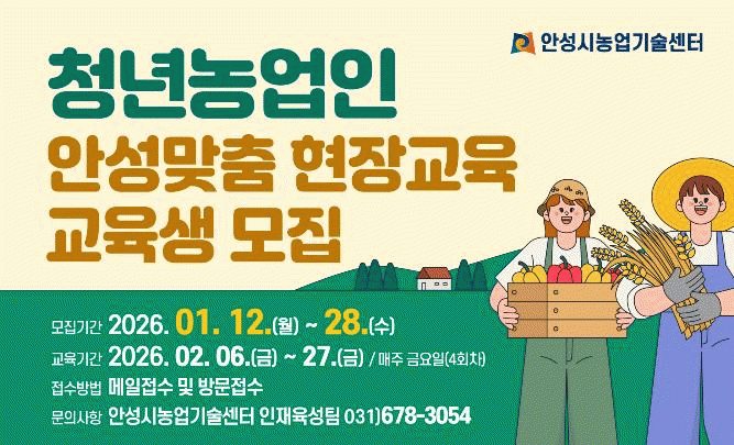 ¸ðÁý ±â°£Àº 1¿ù 12ÀϺÎÅÍ 28ÀϱîÁöÀÌ¸ç ¸ðÁý ÀοøÀº 15¸íÀ¸·Î, ¾È¼º½Ã û³â³ó¾÷Àΰú â³óÀ» Èñ¸ÁÇÏ´Â ¸¸ 18¼¼ ÀÌ»ó 40¼¼ ¹Ì¸¸ û³âÀ» ´ë»óÀ¸·Î ÇÑ´Ù.