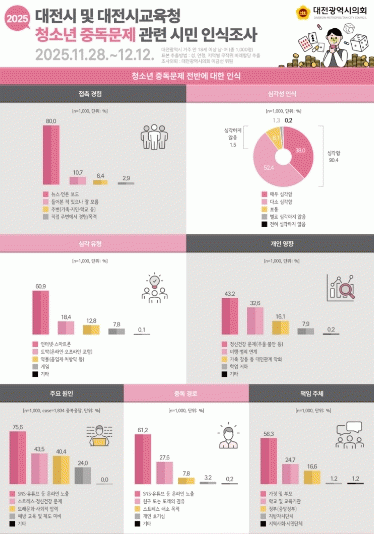 À̹ø ¿©·ÐÁ¶»ç´Â Á¶»çÀü¹®±â°üÀ» ÅëÇØ 22°³ ¹®Ç׿¡ ´ëÇØ ´ëÀü½Ã¿¡ °ÅÁÖÇÏ´Â ¸¸ 18¼¼ ÀÌ»ó ³²³à 1,000¸íÀ» ´ë»óÀ¸·Î 2025³â 11¿ù 28ÀϺÎÅÍ 12¿ù 12ÀϱîÁö 15Àϰ£ ½Ç½Ã(95% ½Å·Ú¼öÁØ ¡¾3.1%Æ÷ÀÎÆ®)ÇßÀ¸¸ç Á¶»ç °á°ú ´ëÀü ½Ã¹ÎÀÇ 90.4%°¡ û¼Ò³â Áßµ¶¹®Á¦¸¦ ¡®½É°¢ÇÏ´Ù¡¯°í ÀνÄÇϰí ÀÖ´Â °ÍÀ¸·Î ³ªÅ¸³ª, û¼Ò³â Áßµ¶¹®Á¦°¡ Áö¿ª»çȸ Àü¹ÝÀÇ Áß´ëÇÑ »çȸ ¹®Á¦·Î Àνĵǰí ÀÖÀ½ÀÌ È®ÀεƴÙ.