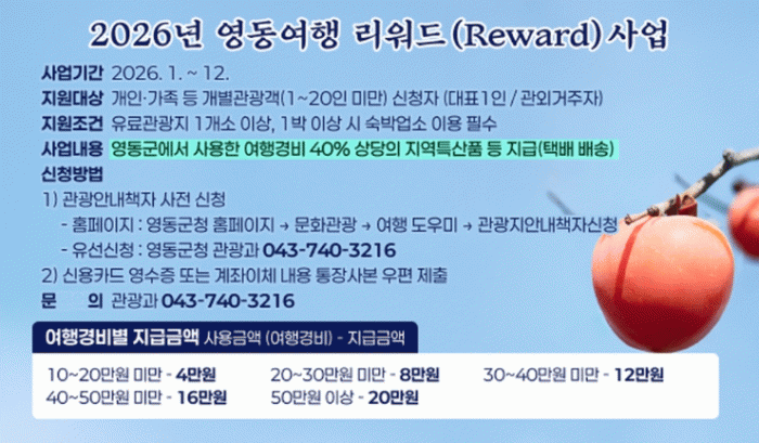 À̹ø »ç¾÷Àº ¿µµ¿À» ¹æ¹®ÇÏ´Â °ü¿Ü °ÅÁÖ °³º° °ü±¤°´(1~20ÀÎ ¹Ì¸¸)À» ´ë»óÀ¸·Î, ¿µµ¿±º¿¡¼ »ç¿ëÇÑ ¿©Çà°æºñÀÇ 40% »ó´çÀ» ÃÖ´ë 20¸¸ ¿ø±îÁö Áö¿ªÆ¯»êǰ µîÀ¸·Î Áö¿øÇÏ´Â °ÍÀÌ ÇÙ½ÉÀÌ´Ù.