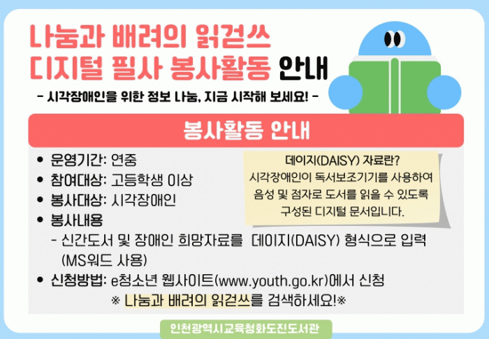 ¡®µðÁöÅÐ ÇÊ»ç ºÀ»çȰµ¿¡¯Àº ½Å°£µµ¼ ¹× ½Ã°¢Àå¾ÖÀÎÀÇ ¿äû ÀڷḦ MS¿öµå·Î ÀÛ¼ºÇϴ Ȱµ¿ÀÌ´Ù. ¿Ï¼ºµÈ ÇÊ»ç ÀÚ·á´Â ½Ã°¢Àå¾ÖÀÎÀÌ À½¼º°ú Á¡ÀڷΠåÀ» ÀÐÀ» ¼ö ÀÖ´Â ÀÚ·á·Î º¯È¯ÇØ ¡®±¹°¡´ëüÀÚ·á°øÀ¯½Ã½ºÅÛ(DREAM)¡¯¿¡ ¾÷·Îµå ÈÄ Àå¾ÖÀεéÀÌ ÀÌ¿ëÇÒ ¼ö ÀÖµµ·Ï Á¦°øµÈ´Ù.