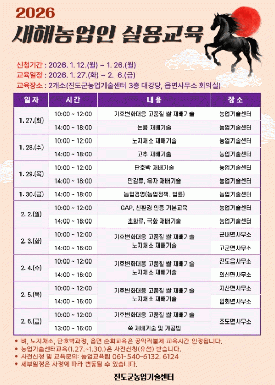 Áøµµ±ºÀº ¡®2026³âµµ »õÇØ ³ó¾÷ÀÎ ½Ç¿ë±³À°¡¯À» ¿À´Â 1¿ù 27ÀϺÎÅÍ 2¿ù 6ÀϱîÁö 2ÁÖ µ¿¾È Áøµµ±º³ó¾÷±â¼ú¼¾ÅÍ µî¿¡¼ ÁøÇàÇÑ´Ù.