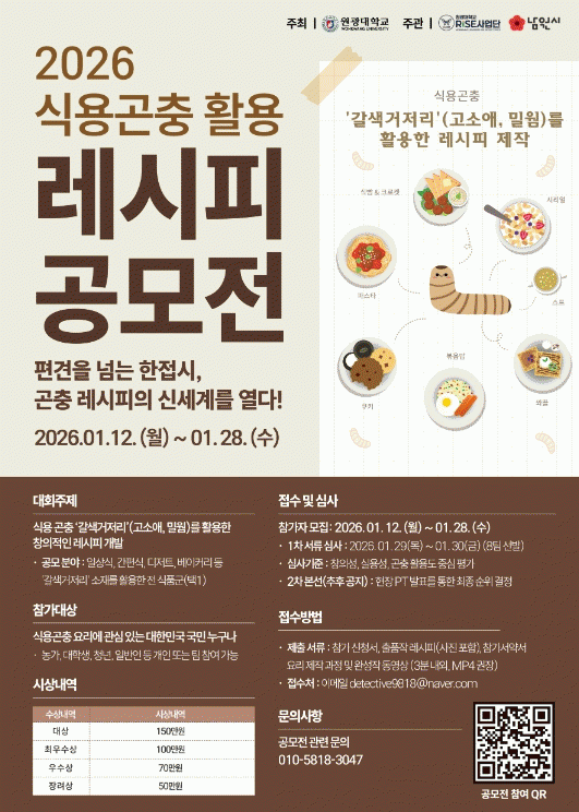 À̹ø °ø¸ðÀüÀº ½Ä¿ë °ïÃæ ¿ä¸®¿¡ °ü½É ÀÖ´Â ´ëÇѹα¹ ±¹¹ÎÀÌ¸é ´©±¸³ª Âü¿©ÇÒ ¼ö ÀÖÀ¸¸ç, ¼ö»óÀÚ´Â ´ë»ó 1ÆÀ(150¸¸ ¿ø), ÃÖ¿ì¼ö»ó 1ÆÀ(100¸¸ ¿ø), ¿ì¼ö»ó 1ÆÀ(70¸¸ ¿ø), Àå·Á»ó 1ÆÀ(50¸¸ ¿ø)À» ¼±Á¤ÇÑ´Ù.