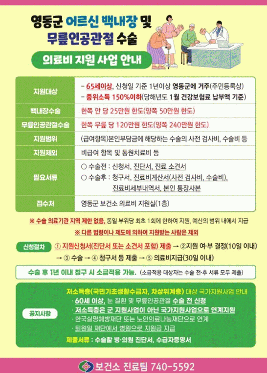 Áö¿ø ±Ô¸ð´Â ¹é³»Àå ¼ö¼úÀÇ °æ¿ì ÇÑÂÊ ´«(1¾È)´ç 25¸¸ ¿ø(¾çÂÊ ÃÖ´ë 50¸¸ ¿ø), ¹«¸Àΰø°üÀý ¼ö¼úÀº ÇÑÂÊ ¹«¸ ´ç 120¸¸ ¿ø(¾çÂÊ ÃÖ´ë 240¸¸ ¿ø)±îÁöÀ̸ç, º»Àκδã±Ý Áß »çÀü °Ë»çºñ¡¤¼ö¼úºñ µî ±Þ¿©Ç׸ñ¿¡ ÇØ´çÇÏ´Â ºñ¿ëÀ» Áö¿øÇÑ´Ù.