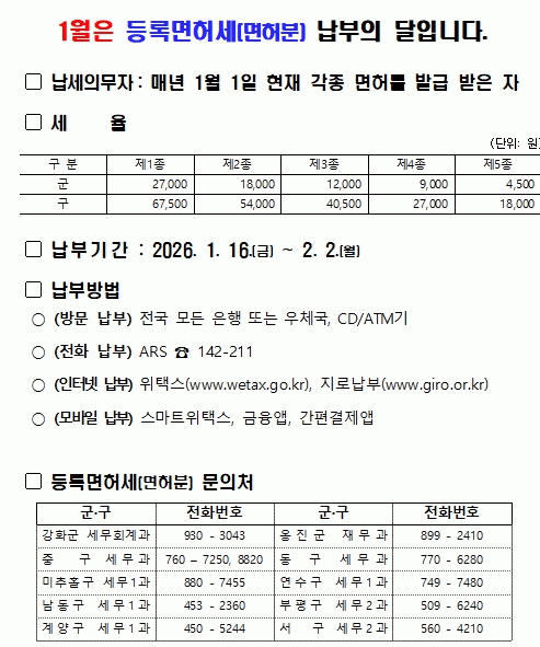 Á¤±âºÐ µî·Ï¸éÇã¼¼´Â ¸Å³â 1¿ù 1ÀÏÀ» ±âÁØÀ¸·Î ¸éÇã À¯È¿±â°£ÀÌ 1³âÀ» ÃʰúÇÏ´Â Àΰ¡¡¤Çã°¡¡¤µî·Ï µî °¢Á¾ ¸éÇ㸦 ¹ÞÀº ÀÚ¸¦ ´ë»óÀ¸·Î, ¸éÇã Á¾·ù¿Í »ç¾÷Àå ¸éÀû µî¿¡ µû¶ó 1¿ù¿¡ Â÷µî ºÎ°úµÈ´Ù.
