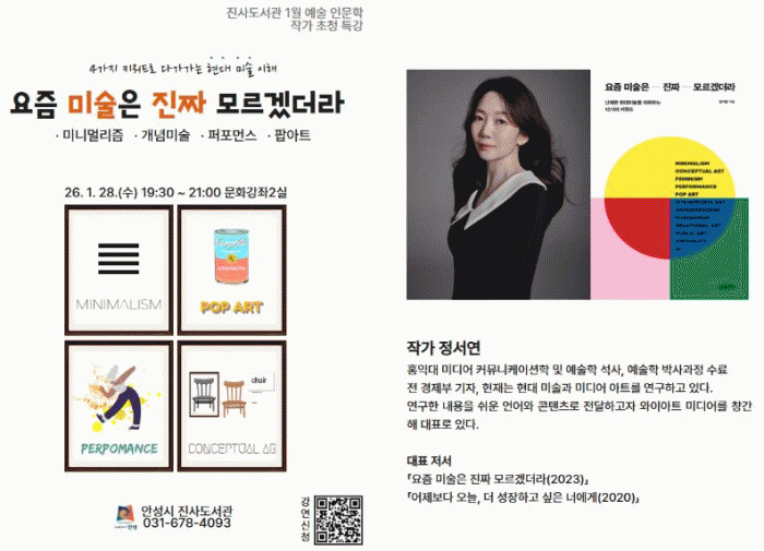 À̹ø °¿¬Àº Çö´ë¹Ì¼úÀÌ ¾î·Æ°í ³¸¼³°Ô ´À²¸Áö´Â ½Ã¹ÎµéÀ» À§ÇØ ±âȹµÈ ÇÁ·Î±×·¥ÀÌ´Ù. °¿¬¿¡¼´Â ¹Ì´Ï¸Ö¸®Áò, °³³ä¹Ì¼ú, ÆÛÆ÷¸Õ½º, ÆË¾ÆÆ® µî ³× °¡Áö Ű¿öµå¸¦ Áß½ÉÀ¸·Î Á¤¼¿¬ ÀÛ°¡ ƯÀ¯ÀÇ °¨¼ºÀû ÇØ¼®°ú ´Ù¾çÇÑ ÀÛǰ »ç·Ê¸¦ ¼Ò°³ÇÑ´Ù. À̸¦ ÅëÇØ ¡°¿Ö ¿äÁò ¹Ì¼úÀÌ ÀÌ·¸°Ô º¸ÀÌ´ÂÁö¡±¿¡ ´ëÇÑ ±Ã±ÝÁõÀ» Ç®°í, ½Ã¹ÎµéÀÌ ½º½º·ÎÀÇ °¨»ó ±âÁØÀ» Çü¼ºÇϵµ·Ï µ½´Â ½Ã°£À» ¸¶·ÃÇÒ ¿¹Á¤ÀÌ´Ù.