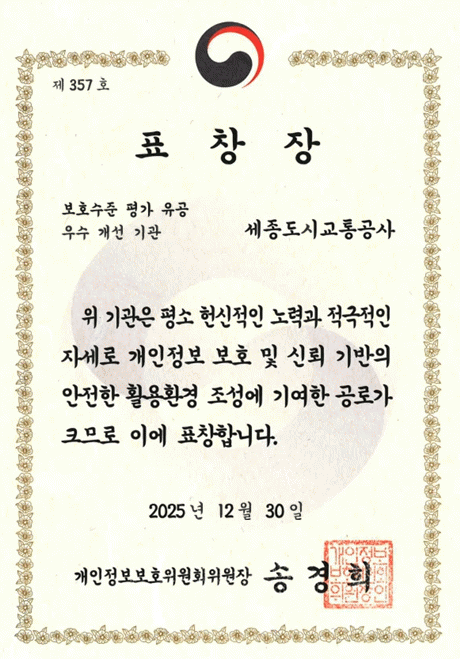 À̹ø ¼º°ú¸¦ ÅëÇØ ¼¼Á¾µµ½Ã±³Åë°ø»ç´Â ¢º °³ÀÎÁ¤º¸ º¸È£ ü°è °íµµÈ ¢º ¹ýÀû Áؼö»çÇ× ÀÌÇà ¹× ½ÇÁúÀû º¸È£ ¿ª·® °È ¢º ´ë¿Ü ½Å·Úµµ ¹× ±â°ü À̹ÌÁö Á¦°í ¶ó´Â ½ÇÁúÀûÀÎ ÃßÁø È¿°ú¸¦ °ÅµÐ °ÍÀ¸·Î Æò°¡¹Þ°í ÀÖ´Ù.