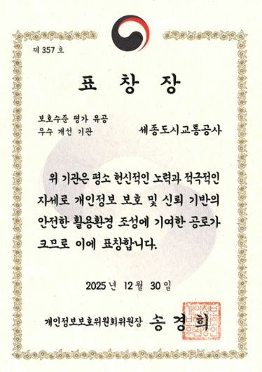À̹ø ¼º°ú¸¦ ÅëÇØ ¼¼Á¾µµ½Ã±³Åë°ø»ç´Â ¢º °³ÀÎÁ¤º¸ º¸È£ ü°è °íµµÈ ¢º ¹ýÀû Áؼö»çÇ× ÀÌÇà ¹× ½ÇÁúÀû º¸È£ ¿ª·® °È ¢º ´ë¿Ü ½Å·Úµµ ¹× ±â°ü À̹ÌÁö Á¦°í ¶ó´Â ½ÇÁúÀûÀÎ ÃßÁø È¿°ú¸¦ °ÅµÐ °ÍÀ¸·Î Æò°¡¹Þ°í ÀÖ´Ù.