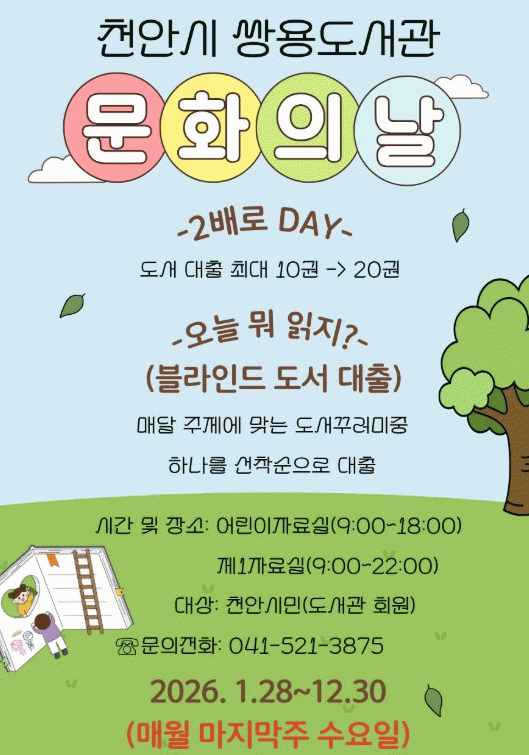 ½Ö¿ëµµ¼°üÀº ¿ÃÇØ ¹®È°¡ ÀÖ´Â ³¯¿¡ 1Àδç 20±ÇÀÇ Ã¥À» ºô¸± ¼ö ÀÖ´Â ¡®2¹è·Î Day¡¯¿Í ºí¶óÀÎµå µµ¼ ´ëÃâ Çà»ç ¡®¿À´Ã ¹¹ ÀÐÁö?¡¯¸¦ ¿î¿µÇÑ´Ù.