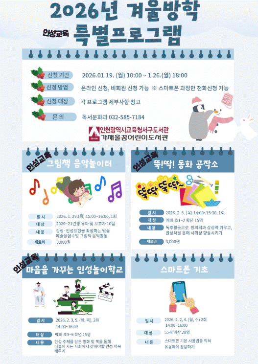 À̹ø ÇÁ·Î±×·¥Àº À¯¡¤¾Æµ¿ÀÇ Àμº±³À° °È¿Í Áß¡¤Àå³âÃþÀÇ µðÁöÅÐ ¿ª·® °È¸¦ À§ÇØ ¸¶·ÃÇßÀ¸¸ç À¯¡¤¾Æµ¿ ´ë»ó ¡®±×¸²Ã¥ À½¾Ç³îÀÌÅÍ¡¯, ¡®¶Ò!µü! µ¿È°øÀÛ¼Ò¡¯, ¡®¸¶À½À» °¡²Ù´Â Àμº³îÀÌÇб³¡¯¿Í 55¼¼ ÀÌ»ó ¾î¸£½Å ´ë»ó ¡®½º¸¶Æ®Æù ±âÃÊ¡¯ °Á·Π±¸¼ºÇß´Ù.