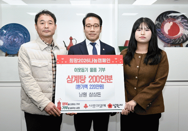 ¹°Ç° Àü´Þ½ÄÀº ³²¿ø½Ãû¿¡¼ ³²¿ø½ÃÀå°ú »ï»ïµ· ´ëÇ¥°¡ Âü¼®ÇÑ °¡¿îµ¥ ÁøÇàµÆÀ¸¸ç, ±âºÎµÈ »ï°èÅÁÀº °ü³» ½Ä»ýȰ Ãë¾à°èÃþ¿¡ Àü´ÞµÆ´Ù.