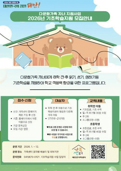 ±ºÀº ´Ù¹®È°¡Á· ÀÚ³àÀÇ ÇнÀ °ÝÂ÷¸¦ ÇØ¼ÒÇÏ°í ¾ÈÁ¤ÀûÀÎ Çб³ ÀûÀÀÀ» µ½±â À§ÇØ, °ü³» 5~9¼¼ ¾Æµ¿À» ´ë»óÀ¸·Î ±âÃÊ ÇнÀÀ» ¹«·á·Î Á¦°øÇÏ´Â ¡®2026³â ±âÃÊÇнÀÁö¿ø »ç¾÷¡¯À» žȱº °¡Á·¼¾ÅÍ¿¡¼ ÃßÁøÇÑ´Ù°í ¹àÇû´Ù.