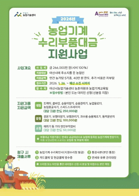 Áö¿ø´ë»óÀº ¾Æ»ê½Ã ³ó¾÷ÀÎÀ̸ç, Áö¿ø ±âÁ¾Àº ¸é¼¼À¯ µî·ÏÀÌ µÈ ³ó¾÷±â°èÀÌ´Ù. ³ó°¡´ç ÃÖ´ë 5±âÁ¾, ÃÖ´ë 40¸¸ ¿ø Çѵµ·Î ¼ö¸®ºÎǰ´ë±ÝÀ» Áö¿ø¹ÞÀ» ¼ö ÀÖ´Ù.