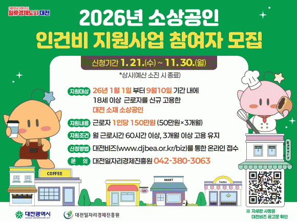 Áö¿ø´ë»óÀº ´ëÀü½Ã¿¡¼ »ç¾÷ÀåÀ» ¿î¿µ ÁßÀÎ ¼Ò»ó°øÀÎÀ¸·Î, 2026³â 1¿ù 1ÀϺÎÅÍ 9¿ù 10ÀÏ »çÀÌ¿¡ 18¼¼ ÀÌ»ó(2008³â 1¿ù 1ÀÏ ÀÌÀü Ãâ»ý) ±Ù·ÎÀÚ¸¦ ½Å±Ô °í¿ëÇÑ ¾÷ü´Ù.