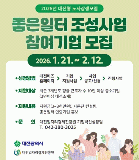 »ç¾÷ Âü¿©¸¦ Èñ¸ÁÇÏ´Â ±â¾÷Àº 2¿ù 12ÀϱîÁö ´ëÀü½Ã ¶Ç´Â ´ëÀüÀÏÀÚ¸®°æÁ¦ÁøÈï¿ø ¡®´ëÀüºñÁ ȨÆäÀÌÁö¿¡ °Ô½ÃµÈ »ç¾÷½Åû¼ µîÀ» ÀÛ¼ºÇÏ¿© ´ëÀüÀÏÀÚ¸®°æÁ¦ÁøÈï¿ø(±â¾÷Çõ½Å¼ºÀåÆÀ)¿¡ ¹æ¹®.½ÅûÇÏ¸é µÈ´Ù.