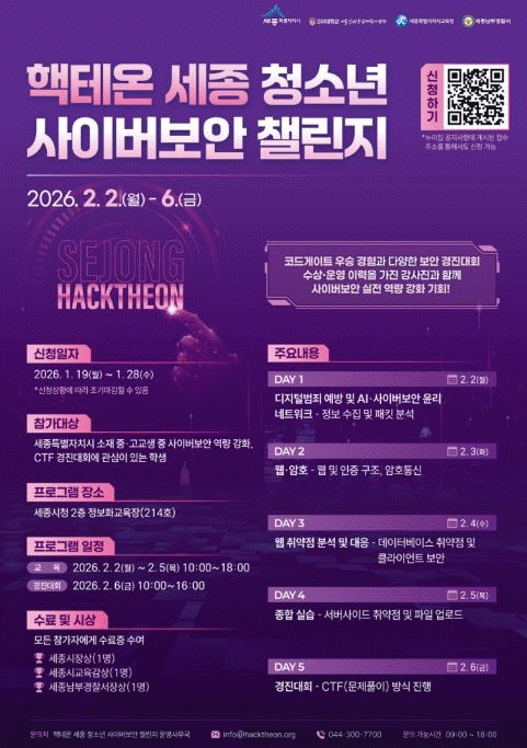 ¼¼Á¾Æ¯º°ÀÚÄ¡½Ã´Â ¿À´Â 28ÀϱîÁö °ü³» Áß°íµîÇлýÀ» ´ë»óÀ¸·Î ÇÙÅ׿ ¼¼Á¾ û¼Ò³â »çÀ̹öº¸¾È 縰Áö Âü°¡ÀÚ¸¦ ¸ðÁýÇÑ´Ù°í ¹àÇû´Ù.