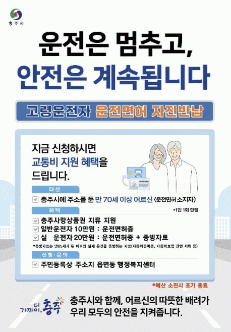 ÃæÁֽô 2025³â±îÁö ¡®¿îÀü ¸éÇ㸦 ÀÚÁø ¹Ý³³ÇÑ ¸¸ 70¼¼ ÀÌ»ó °í·É¿îÀüÀÚ¡¯¿¡°Ô ÃæÁÖ»ç¶û»óǰ±Ç(Áö·ù) 10¸¸ ¿øÀ» Áö±ÞÇØ ¿ÔÀ¸³ª, 2026³âºÎÅÍ´Â ¡®½ÇÁ¦ ¿îÀü ÀÌ·ÂÀÌ ÀÖ´Â °í·É ¿îÀüÀÚ¡¯¸¦ ´ë»óÀ¸·Î Àμ¾Æ¼ºê¸¦ 20¸¸ ¿øÀ¸·Î È®´ë Áö±ÞÇÑ´Ù.