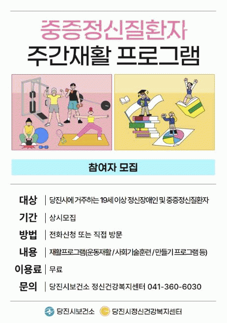 ÁÖ°£ÀçȰ ÇÁ·Î±×·¥Àº ÁßÁõ Á¤½ÅÁúȯÀÚÀÇ »çȸ º¹±Í¿¡ ÇÊ¿äÇÑ ´Ù¾çÇÑ È°µ¿À» Á¦°øÇØ Âü¿©ÀÚÀÇ ÀçȰ ÀÇÁö¸¦ ³ôÀ̰í, ÁÖüÀûÀÌ°í µ¶¸³ÀûÀÎ »ýȰÀÌ °¡´ÉÇϵµ·Ï Áö¿øÇÏ´Â ÇÁ·Î±×·¥ÀÌ´Ù.