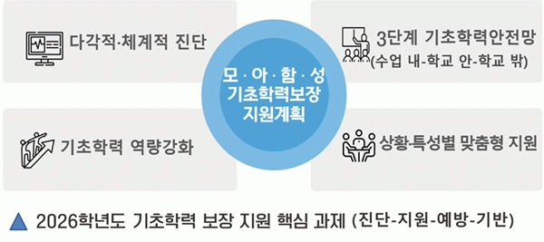 ¸ÕÀú ±âÃÊÇз Áø´Ü°Ë»ç¿Í ¸ÂÃãÇü Çо÷¼ºÃëµµ ÀÚÀ²Æò°¡¸¦ ±¹°¡±âÃÊÇзÂÁö¿øÆ÷ÅзΠÅëÇÕ ¿î¿µÇÏ¿©, Çлýº° ÇнÀ ÀÌ·ÂÀ» ü°èÀûÀ¸·Î °ü¸®ÇÒ ¼ö ÀÖ°Ô µÈ´Ù. ÀÌ·¯ÇÑ Á¤¹Ð Áø´ÜÀ» ¹ÙÅÁÀ¸·Î ±âÃÊÇз Áö¿ø ±Ô¸ð¿Í ´ë»óµµ ´ëÆø È®´ëÇÑ´Ù.
