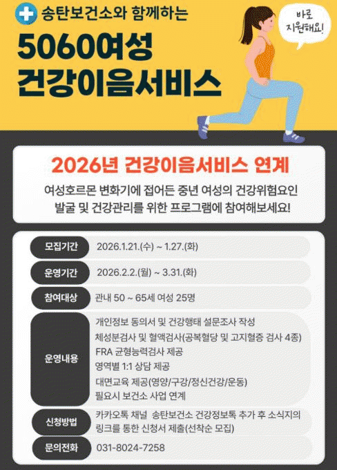 '5060 ¿©¼º °Ç°ÀÌÀ½¼ºñ½º¡¯´Â º¸°Ç¼Ò¸¦ ÇÑ ¹ø¸¸ ¹æ¹®ÇÏ¸é ½Åü °èÃøºÎÅÍ °Ç°»ó´ã ¹× ±³À°, ÇÊ¿ä ºÎ¼ ¿¬°è±îÁö ÅëÇÕÀûÀ¸·Î ¹ÞÀ» ¼ö ÀÖ´Â °Ç°ÀÌÀ½¼ºñ½ºÀÇ ¿¬°è»ç¾÷À¸·Î, ¿©¼ºÈ£¸£¸ó º¯È±â¸¦ °Þ´Â Á߳⠿©¼ºÀÇ °Ç°À§Çè¿äÀÎÀ» ¹Ì¸® ¹ß±¼Çϰí ü°èÀûÀÎ °Ç°°ü¸®¸¦ Áö¿øÇϱâ À§ÇÑ ´ë»óÀÚ ¸ÂÃãÇü ÇÁ·Î±×·¥ÀÌ´Ù.