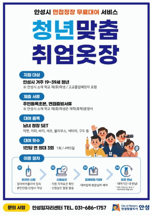 ¸éÁ¢¿¡ ÇÊ¿äÇÑ Á¤À塤±¸µÎ¡¤³ØÅ¸ÀÌ µîÀ» 4¹Ú 5Àϰ£ ¹«·á ´ë¿©Çϸç, 1ÀÎ´ç ¿¬ 3ȸ±îÁö Áö¿øµÈ´Ù. ´ë»óÀº ¾È¼º½Ã °ÅÁÖ 19~39¼¼ û³â ±¸Á÷ÀÚ¿Í ¾È¼º½Ã ¼ÒÀç ´ëÇб³ À硤ÈÞÇлý, °íµîÇб³ Á¹¾÷ ¿¹Á¤ÀÚ´Ù.