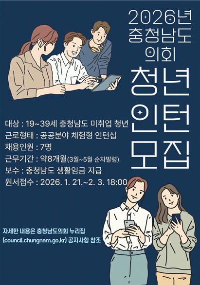 û³âÀÎÅÏÀ¸·Î ¼±¹ßµÇ¸é ÃæÃ»³²µµ »ýȰÀÓ±ÝÀ» ¹Þ°Ô µÇ°í, ±Ù¹« ±â°£Àº 8°³¿ù, ÁÖ 5ÀÏ ÀüÀÏÁ¦·Î 3~5¿ùºÎÅÍ ±Ù¹«¸¦ ½ÃÀÛÇÑ´Ù. Áö¿ø Èñ¸ÁÀÚ´Â Ãæ³²µµÀÇȸ ´©¸®Áý °øÁö»çÇ׿¡ °Ô½ÃµÈ °ø°í¹®À» Âü°íÇØ Áö¿ø¼¸¦ Á¦ÃâÇÏ¸é µÈ´Ù.