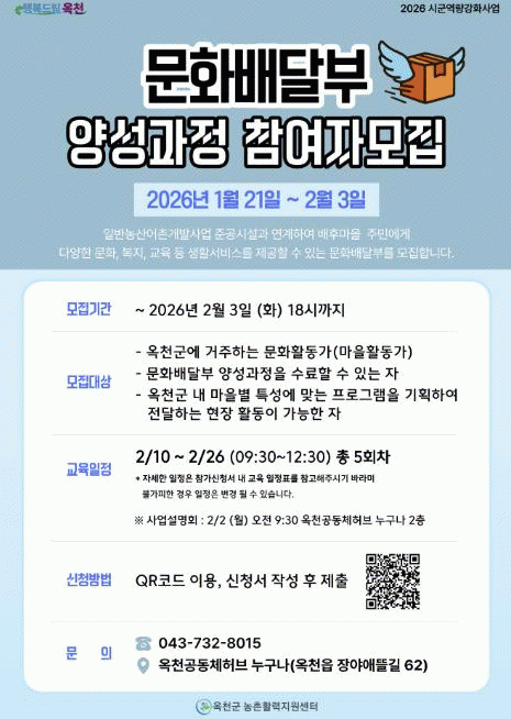 ±³À° ´ë»óÀº ¿Áõ±º¿¡ °ÅÁÖÇÏ´Â ¹®ÈȰµ¿°¡(¸¶À»È°µ¿°¡)À̸ç, ±³À°Àº 2¿ù 10ÀϺÎÅÍ 26ÀϱîÁö ÃÑ 5ȸ¿¡ °ÉÃÄ ÁøÇàµÈ´Ù. ÁÖ¿ä ³»¿ëÀº ¡ã¹®È¹è´ÞºÎ¿¡ ´ëÇÑ ÀÌÇØ ¡ã°ÀÇ ½ºÅ³¾÷ °úÁ¤ ¥°¡¤¥± ¡ãÇÁ·Î±×·¥ ¹ßÇ¥ ¹× ½Ã¿¬ µîÀ¸·Î ±¸¼ºµÈ´Ù.