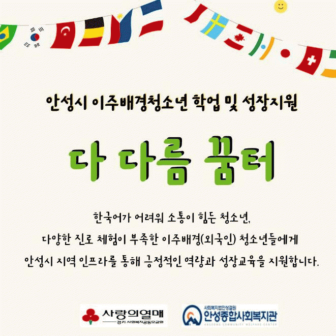 ¡®´Ù´Ù¸§ ²ÞÅÍ¡¯´Â Çѱ¹¾î¿Í Çѱ¹¹®È¿¡ ¾î·Á¿òÀ» °Þ´Â û¼Ò³âÀ» ´ë»óÀ¸·Î °øµ¿Ã¼ ÇÁ·Î±×·¥, Çѱ¹¾î ±³À° µî ÇÁ·Î±×·¥À» Á¦°øÇØ ¾È¼º Áö¿ª»çȸ ±¸¼º¿øÀ¸·ÎÀÇ ¼ºÀåÀ» µ½´Â °ÍÀ» ¸ñÇ¥·Î ÇÑ´Ù.