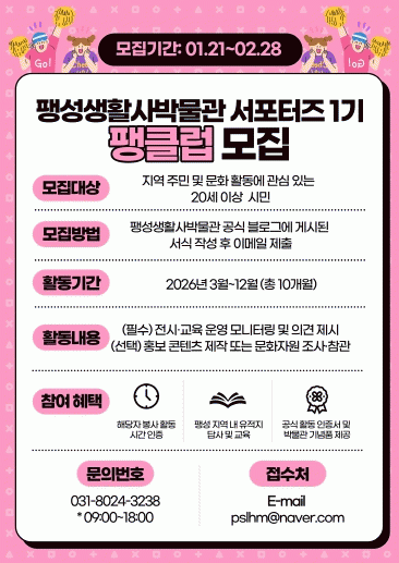 Ȱµ¿Àº 3¿ùºÎÅÍ 12¿ù±îÁö ÃÑ 10°³¿ù°£ ÁøÇàµÈ´Ù. ÆØ¼º»ýȰ»ç¹Ú¹°°ü °ø½Ä ºí·Î±×¿¡¼ ½Åû¼¸¦ ³»·Á¹Þ¾Æ À̸ÞÀÏ·Î Á¢¼öÇÏ¸é µÈ´Ù.