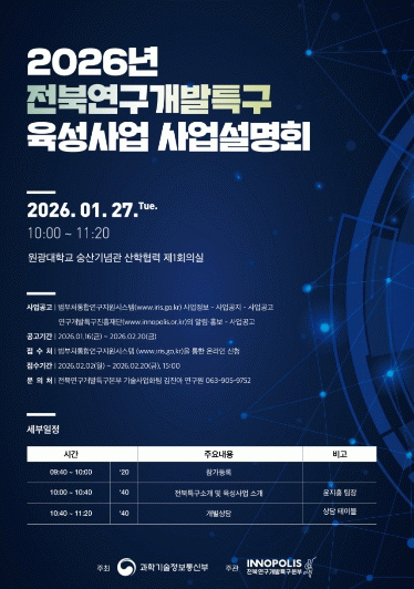 ÀÍ»ê½Ã´Â ¿À´Â 27ÀÏ ¿ø±¤´ëÇб³ ¼þ»ê±â³ä°ü¿¡¼ Ư±¸ ³» ±â¾÷, ´ëÇÐ, ¿¬±¸±â°üÀ» ´ë»óÀ¸·Î '2026 ¿¬±¸°³¹ßƯ±¸ À°¼º»ç¾÷ ¼³¸íȸ'¸¦ °³ÃÖÇÑ´Ù°í 23ÀÏ ¹àÇû´Ù.