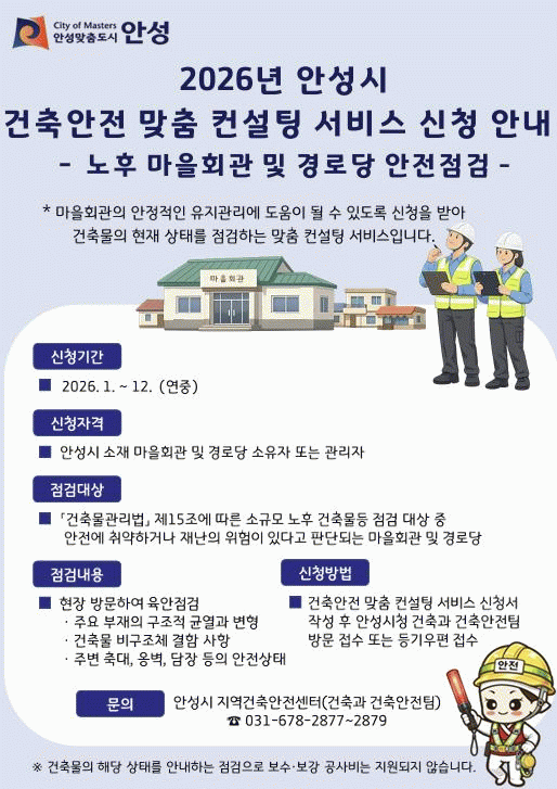 °ÇÃà¾ÈÀü ¸ÂÃã ÄÁ¼³ÆÃ ¼ºñ½º´Â °ü·Ã ¹ý·É»ó Á¤±â Á¡°Ë Àǹ«°¡ ¾ø¾î Á¤È®ÇÑ ½ÇÅ Áø´Ü°ú ¾ÈÀü Ãë¾à ¿ä¼Ò ÆÄ¾Ç¿¡ ¾î·Á¿òÀÌ ÀÖ´Â ¼Ò±Ô¸ð ³ëÈÄ ¸¶À»È¸°ü ¹× °æ·Î´çÀ» ´ë»óÀ¸·Î ¾ÈÀüÁ¡°ËÀ» ½Ç½ÃÇØ, °Ç¹° ³ëÈÄÈ·Î ÀÎÇÑ ¾ÈÀü»ç°í¸¦ ¿¹¹æÇÏ°í ½Ã¹ÎÀÇ ¾ÈÀüÇÑ »ýȰȯ°æ Á¶¼º¿¡ ±â¿©ÇϰíÀÚ ½ÃÇàÇÏ´Â »ç¾÷ÀÌ´Ù.