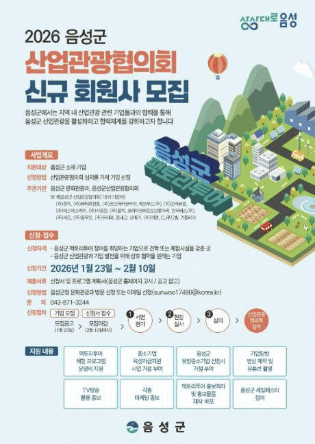 À½¼º±º »ê¾÷°ü±¤ÇùÀÇȸ´Â °ü±¤°´ÀÌ Áñ±æ¸¸ÇÑ °ßÇÐ ¶Ç´Â üÇè½Ã¼³À» °®Ãè°Å³ª ±âŸ ´Ù¾çÇÑ ¹æ½ÄÀ¸·Î À½¼º±º »ê¾÷°ü±¤ Çù·ÂÀ» ¿øÇÏ´Â À½¼º±º ¼ÒÀçÀÇ ±â¾÷ÀÌ¸é °¡ÀÔ ½ÅûÀÌ °¡´ÉÇÏ´Ù.