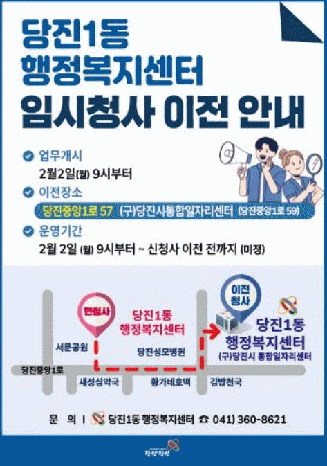 »õ·Ó°Ô ÀÌÀüÇÏ´Â ÀÓ½Ãû»ç´Â ´çÁø½Ã ´çÁøÁß¾Ó1·Î 57¿¡ À§Ä¡ÇÑ (±¸)´çÁø½ÃÅëÇÕÀÏÀÚ¸®¼¾ÅÍ·Î, ÁöÇÏ 1Ãþ~Áö»ó 3Ãþ ±Ô¸ðÀÇ °Ç¹°ÀÌ¸ç ¿î¿µ ±â°£Àº ¿À´Â 2¿ù 2ÀϺÎÅÍ ½Åû»ç °ÇÃàÀÌ ¿Ï·áµÉ ¶§±îÁöÀÌ´Ù.