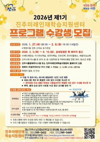 À̹ø ¼ö°»ý ¸ðÁýÀº 27ÀϺÎÅÍ 2¿ù 9ÀϱîÁö ÁøÁֽà ´©¸®ÁýÀÇ ÅëÇÕ¿¹¾à½Ã½ºÅÛ°ú ¹Ì·¡ÀÎÀç¼¾ÅÍ ´©¸®Áý¿¡¼ Á¢¼öÇϸç, À¯¾ÆºÎÅÍ ÃÊ¡¤Áß¡¤°í±³»ý, Çкθð±îÁö ¿¬·É°ú ¼öÁØÀ» °í·ÁÇÑ ¸ÂÃãÇü ±³À°°úÁ¤À¸·Î ±¸¼ºµÈ´Ù.
