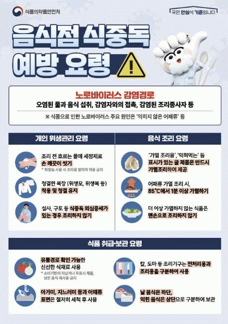 ½ÄÁßµ¶ ¿¹¹æÀ» À§Çؼ´Â ¼Õ ¾Ä±â¿Í ²ú¿© ¸Ô±â, ÀÍÇô ¸Ô±â, ¼¼Ã´Çϱâ, ¼Òµ¶ÇÏ±â µî ±âº»ÀûÀÎ ¾ÈÀü ¼öÄ¢À» ÀÏ»ó»ýȰ¿¡¼ öÀúÈ÷ ½ÇõÇÏ´Â °ÍÀÌ Áß¿äÇϸç, ±¸Å䳪 ¼³»ç µî ½ÄÁßµ¶ÀÌ ÀǽɵǴ Áõ»óÀÌ ³ªÅ¸³¯ °æ¿ì Áï½Ã ÀÇ·á±â°üÀ» ¹æ¹®ÇØ Áø·á¸¦ ¹Þ°í ´Ù¸¥ »ç¶÷¿¡°Ô Á÷¡¤°£Á¢ÀûÀ¸·Î ÀüÆÄµÇÁö ¾Êµµ·Ï °¢º°È÷ ÁÖÀÇÇØ¾ß ÇÑ´Ù.